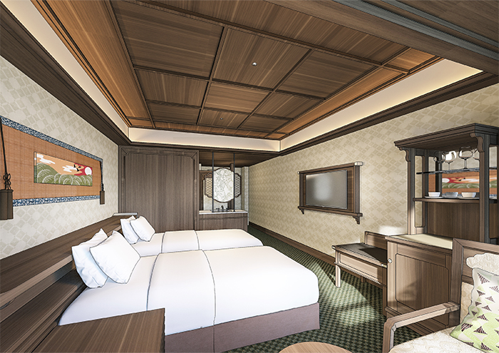 客室は、本館のクラシックな意匠とのつながりを感じられるデザインとして現代的に再解釈され、緑豊かな中庭の自然と奈良の文化が溶け合い、その居心地の良さと快適なバスルームで、非日常感あふれる時間へと誘います。