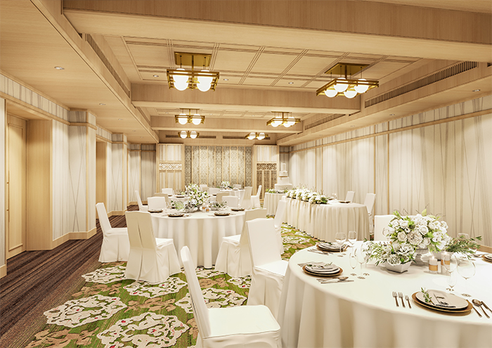 「奈良の歴史を感じさせる正倉院文様をモチーフとした絨毯など、伝統とモダンが調和するシックで落ち着いた会場に生まれ変わります。