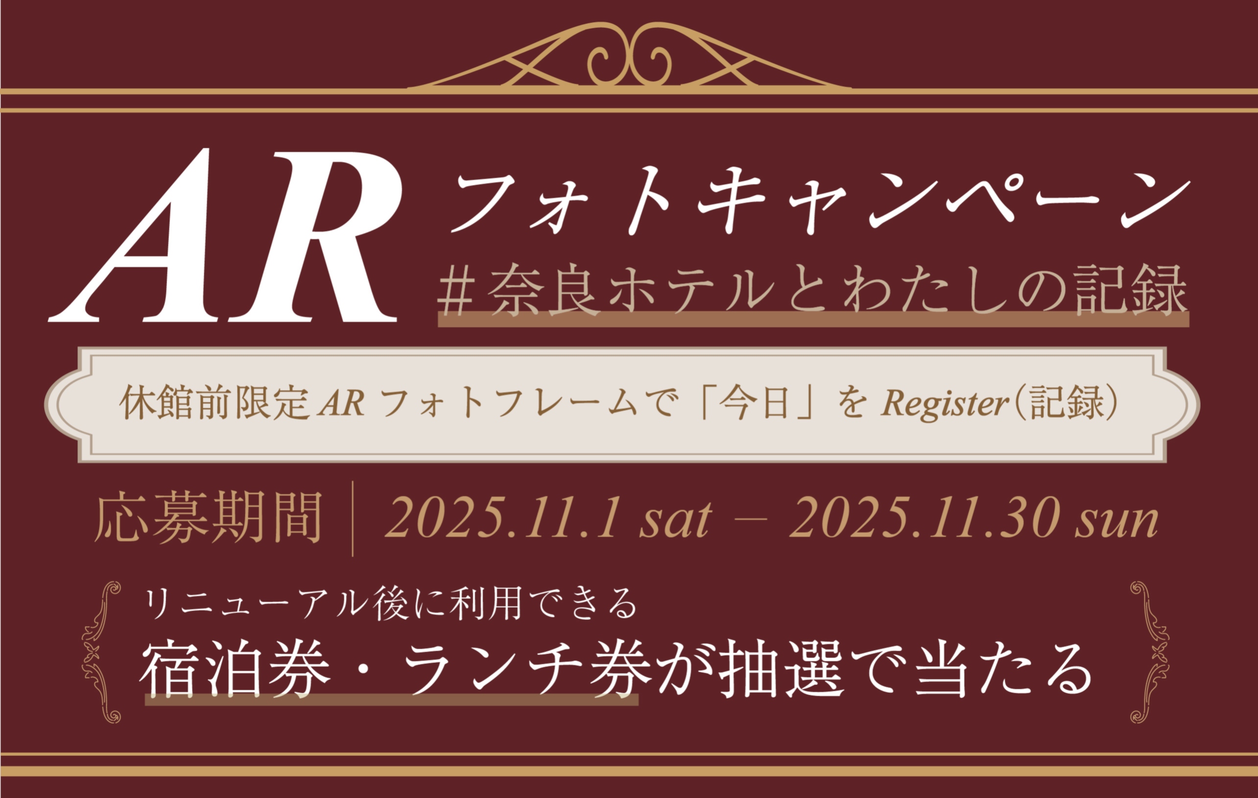 さらに、刻々と近づく休館までの日々を「記録」し「未来」へつなげる体験として、全館休館前限定「奈良ホテルオリジナルARフォトフレーム」をご用意いたしました。