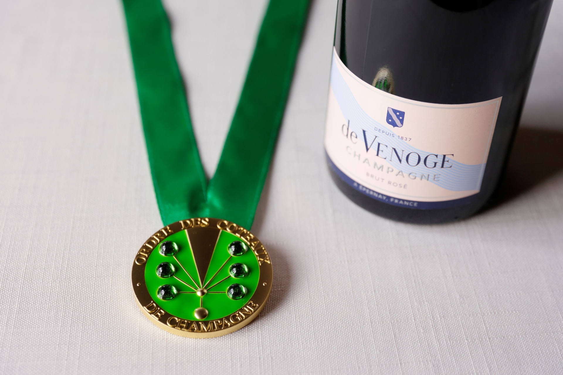 ランチ・ディナーともに乾杯酒としてグラスシャンパーニュを提供いたします。銘柄は、この度、シュヴァリエに叙任されましたソムリエがセレクトしました「ドゥ・ヴノージュ・コルドン・ブルー・ブリュット・ロゼ」です。アルコールを控えておられるお客様にはノンアルコールスパークリングワインをご用意させていただきます。