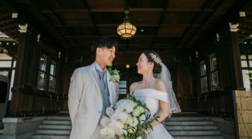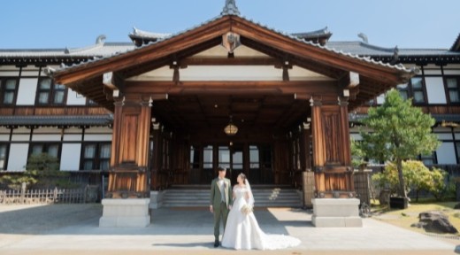 結婚式 ドレスをお召しになり手を繋ぐ新郎新婦様