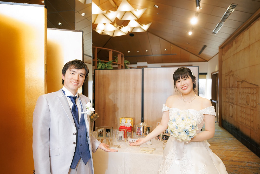 受付もおふたりこだわりのお写真やアイテムが立ち並びます