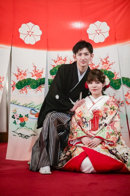 大切に受け継がれてきた 花嫁のれんをバックに♪