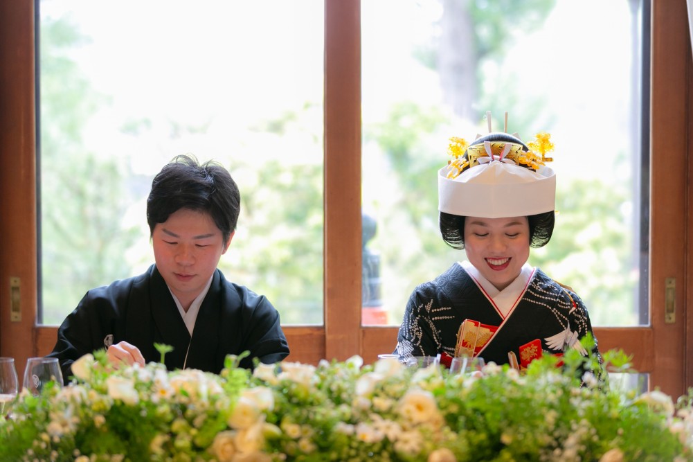 黒の引き振袖に角隠し、日本古来の花嫁姿です