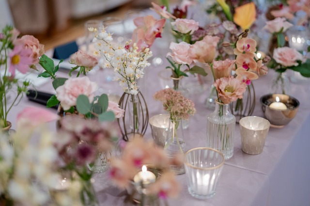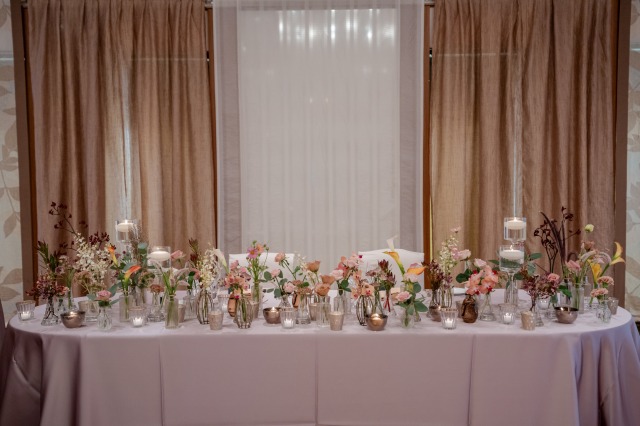 秋らしい色と新婦様チョイスの淡いカラーが会場を彩ります