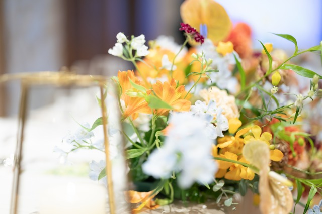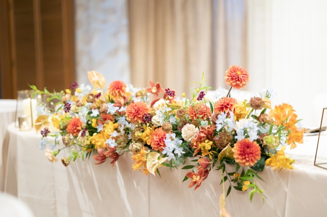 オレンジや黄色の秋色フラワーで彩られた