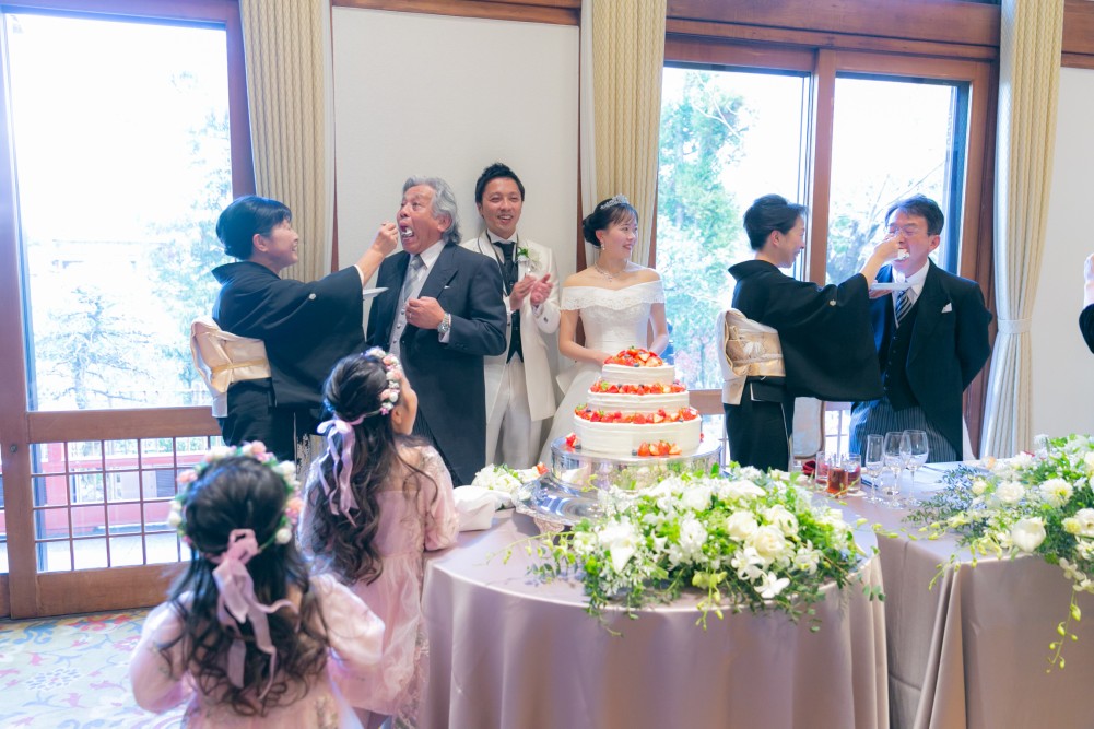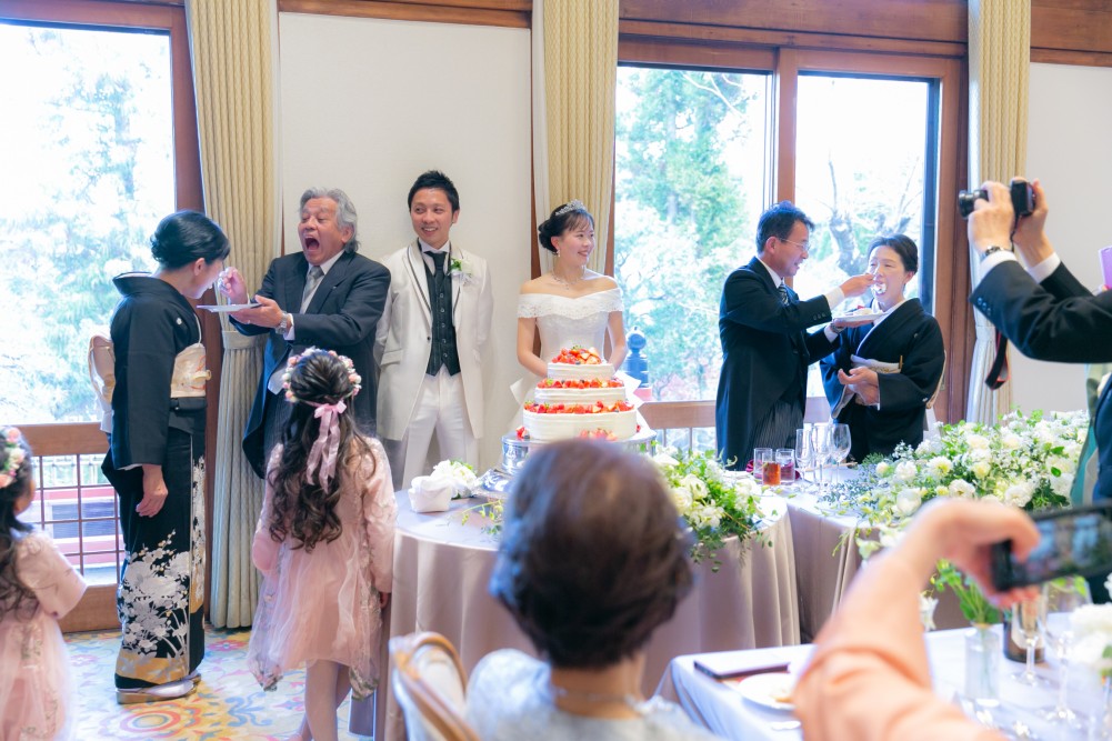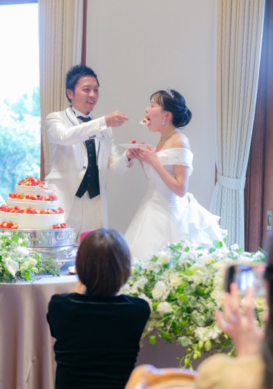 驚きと笑いが広がるなか新婦様は口いっぱいに頬張り