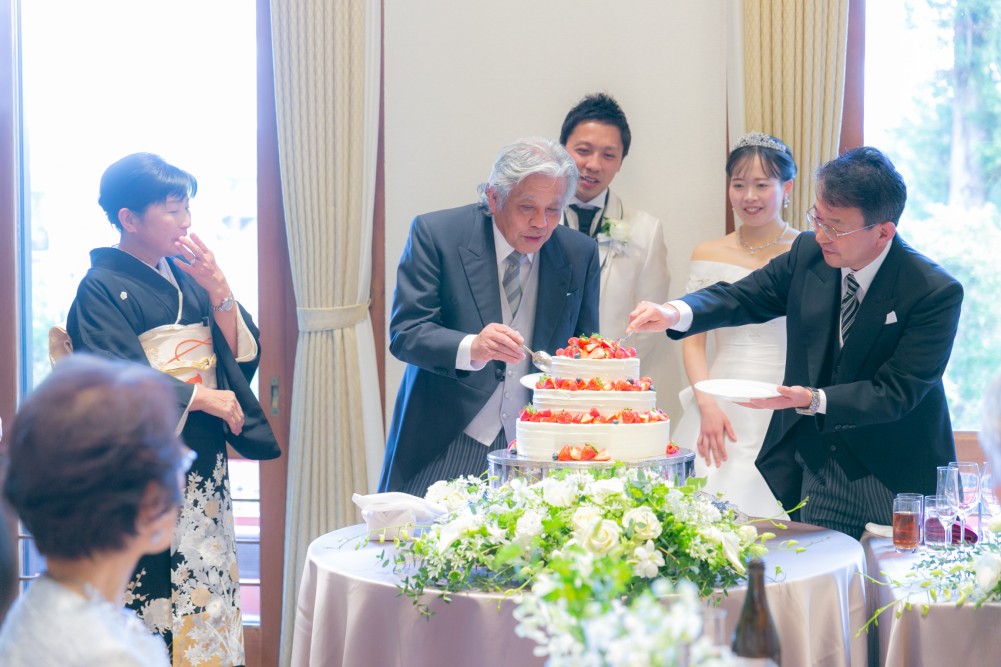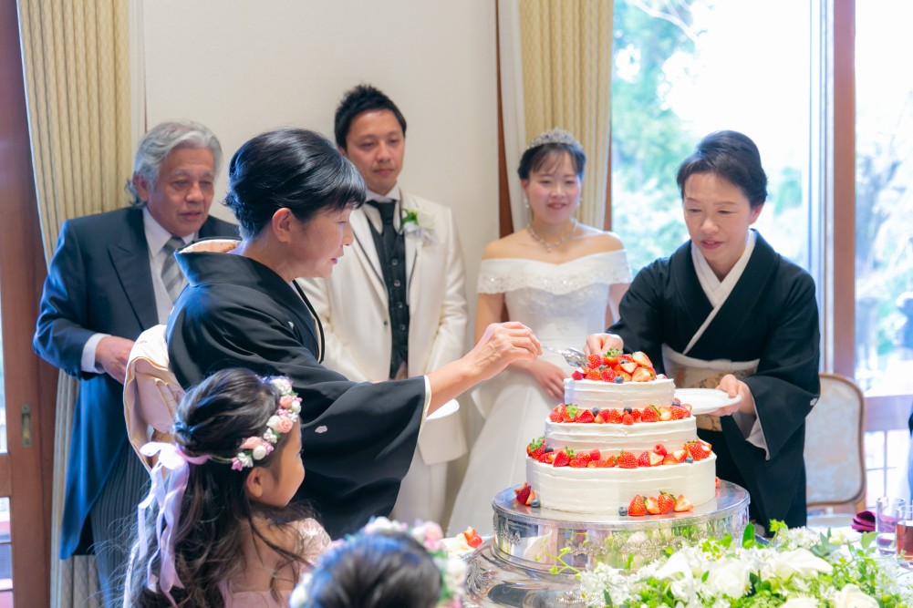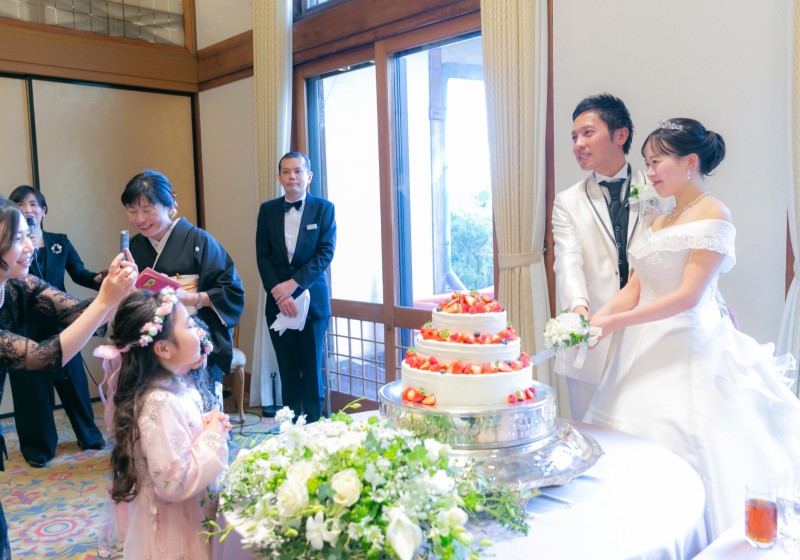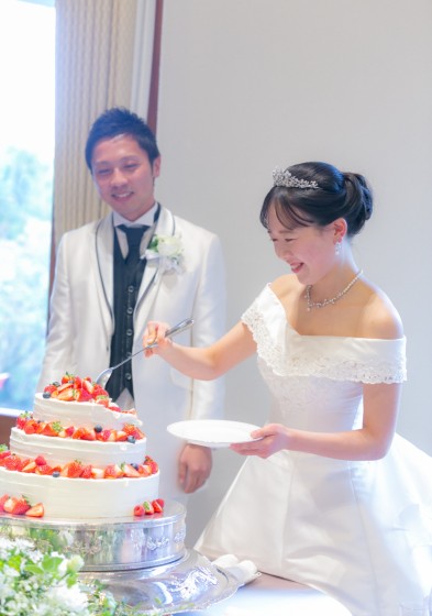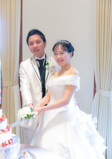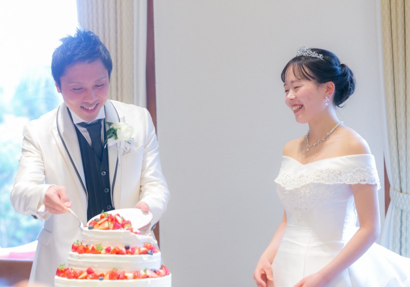 おふたり仲良く手を重ねて大きなケーキにナイフを入れると