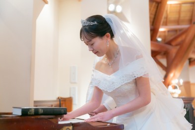 祭壇の前 静けさの中で結婚証明書にそっと署名します