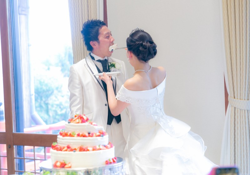 新郎様が笑顔で大きめのケーキをスプーンにのせて