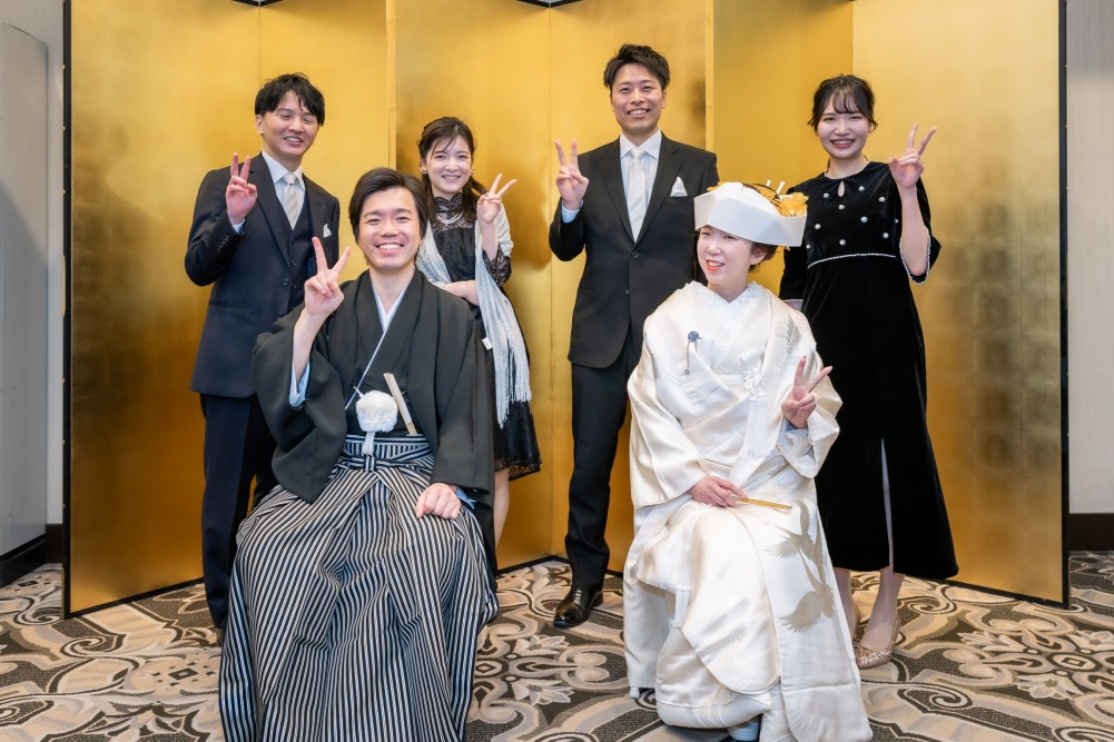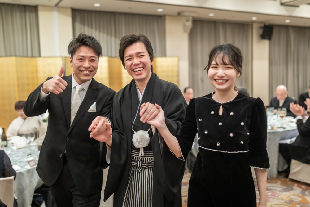 新婦様は普段ご一緒にお仕事をされている同僚のおふたりに、