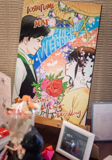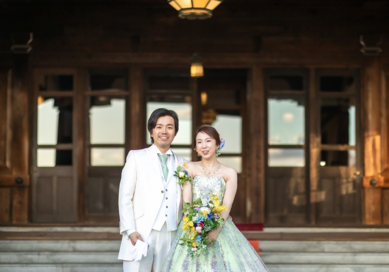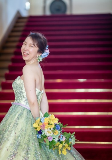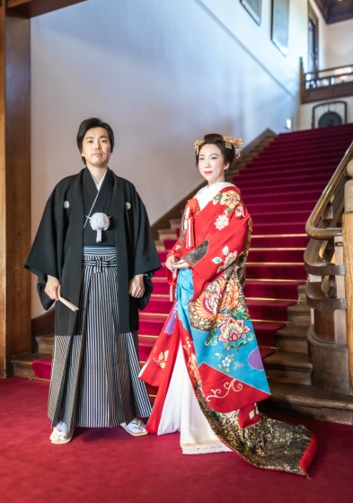 カラフルな差し色が特徴的な色打掛は親御様がご準備くださったお衣装
