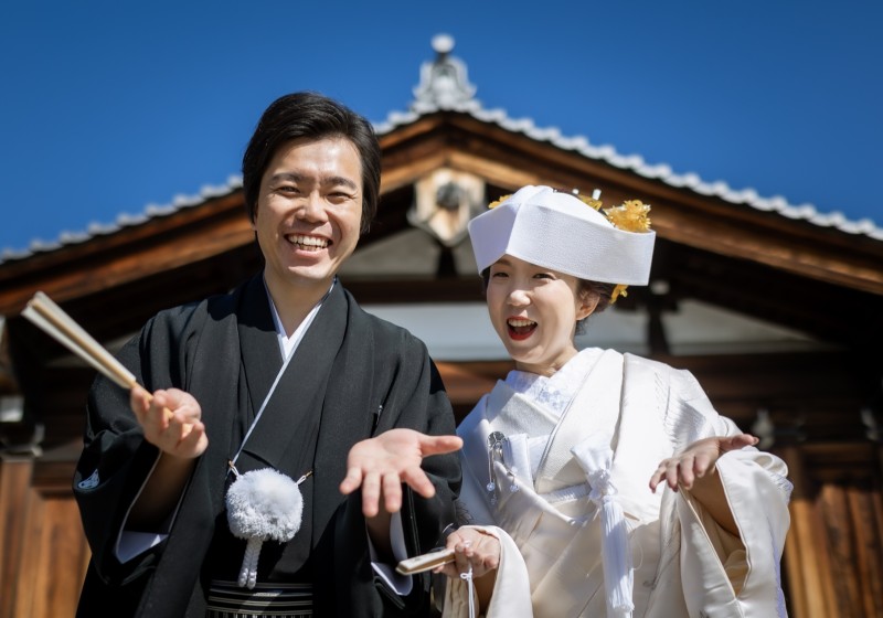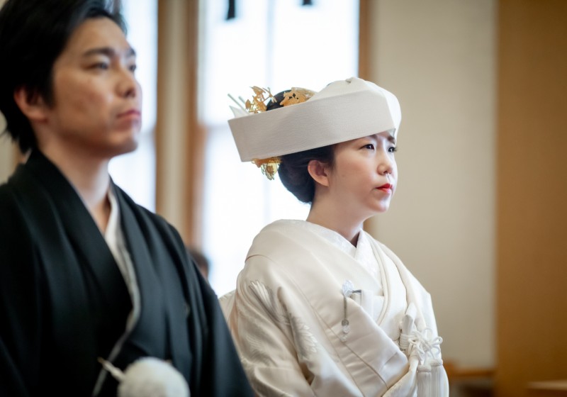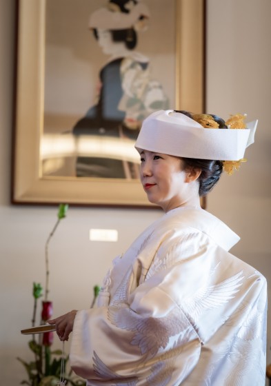 角隠しに白無垢をお召しになり上村松園「花嫁」と同じポーズで撮影