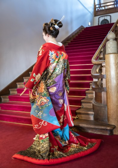 真っ赤な色打掛へお召替えされ華やかな雰囲気へと大変身