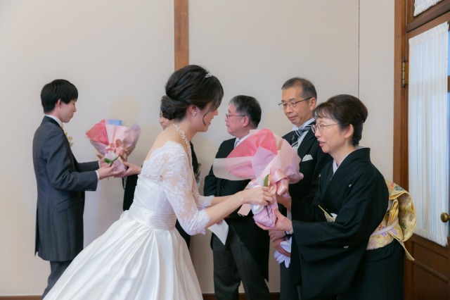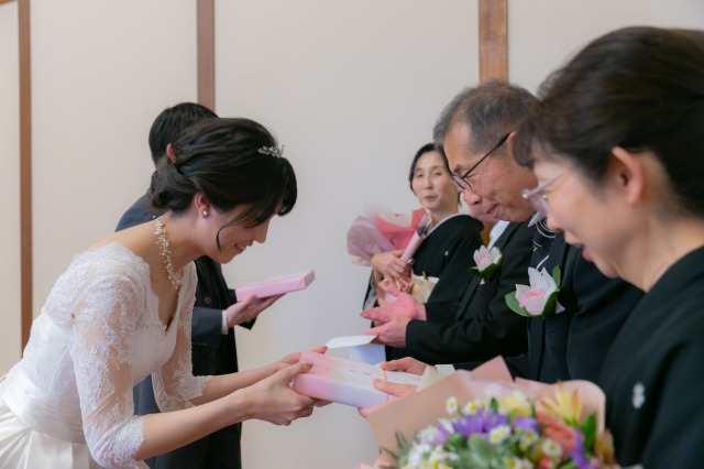 感謝の気持ちを込めて花束とご記念品をお渡しするおふたり