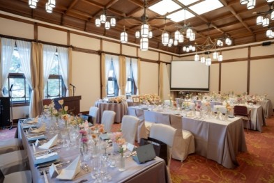 クラシカルな会場に、パステルトーンの花々が優しく彩りを添えます