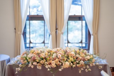 大きな窓辺に飾られたメインテーブルのフラワー装飾は、華やかでありながら上品に