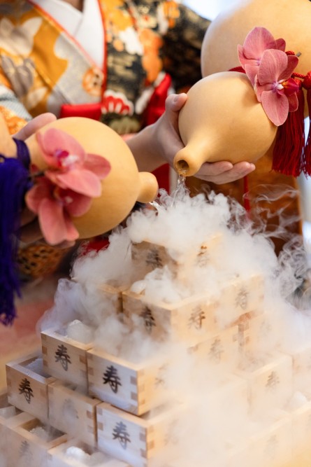 おふたりが升へお水を注ぐと幻想的な雰囲気に