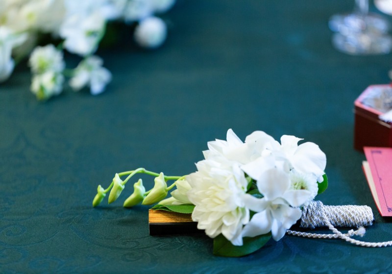 白い生花が特徴的の和装ならではの「扇子ブーケ」や