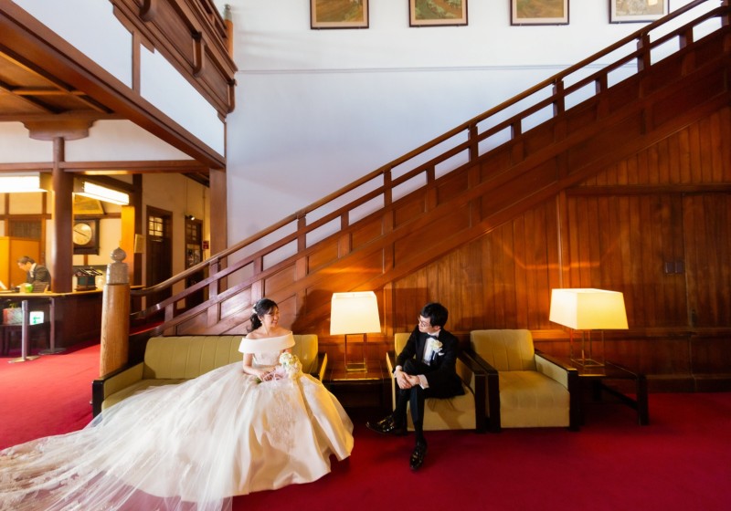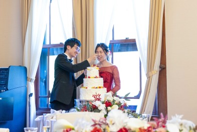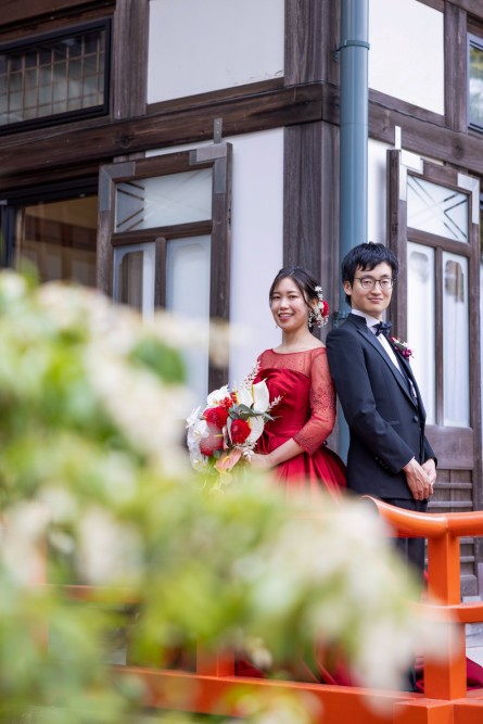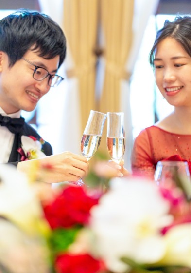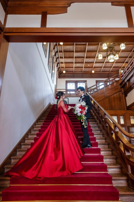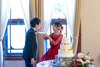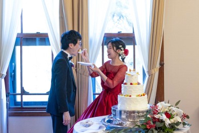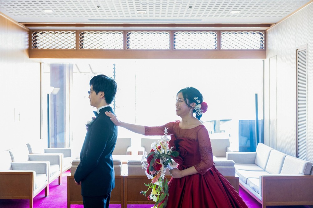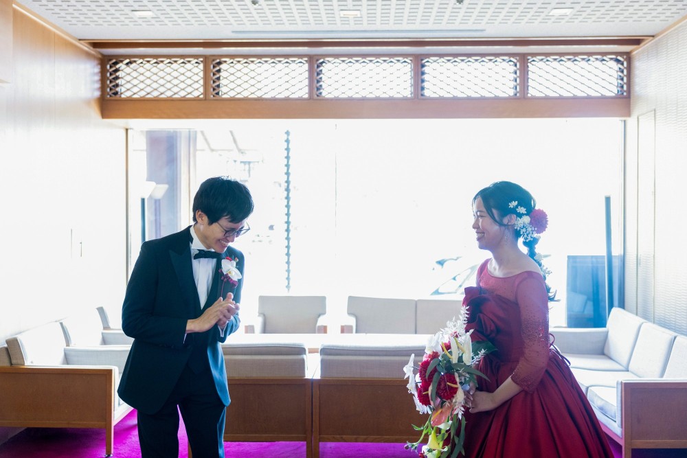 目の前に現れた真紅のドレス姿の新婦様に思わず表情が緩み