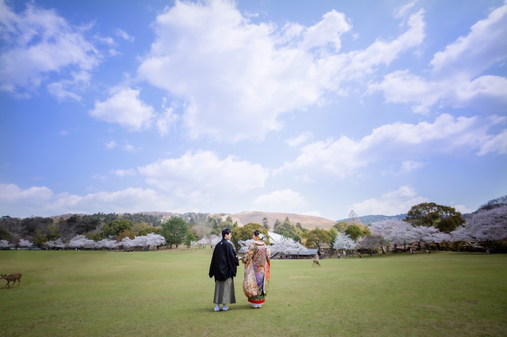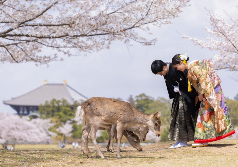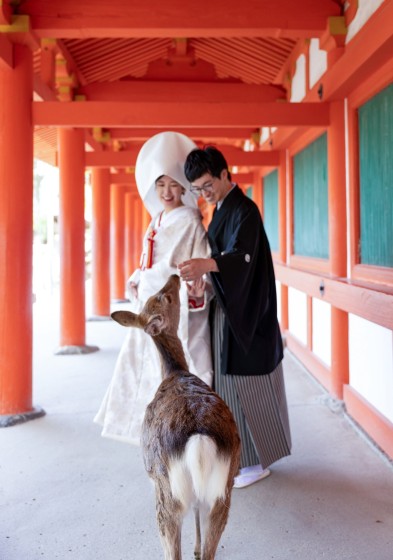 まるでお祝いに駆けつけたかのように鹿たちも近づき