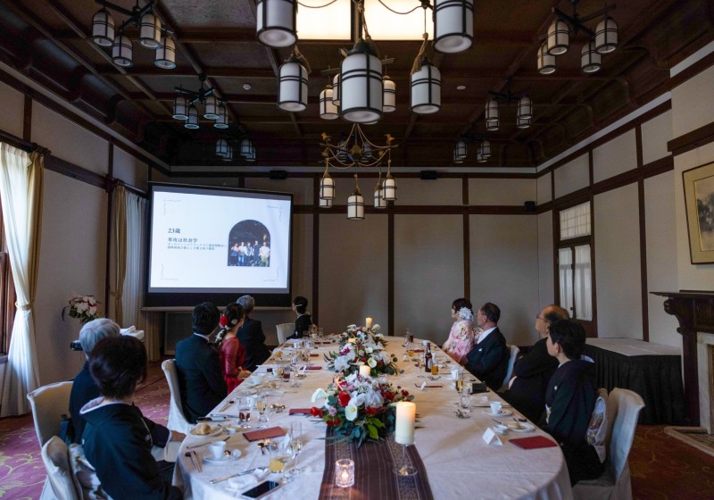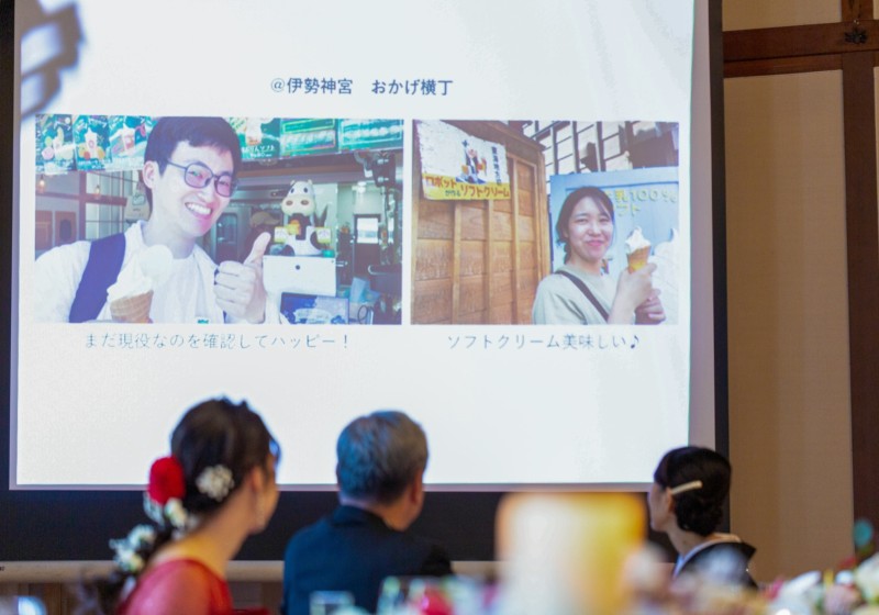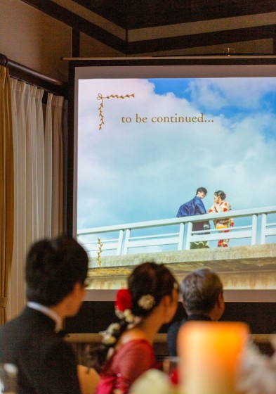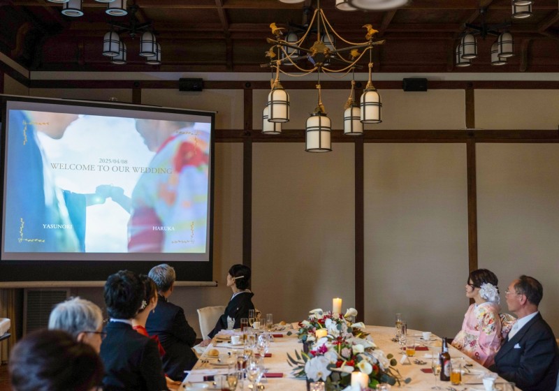 これまで歩んできたおふたりの人生や出会いのエピソードが会場に映し出されると