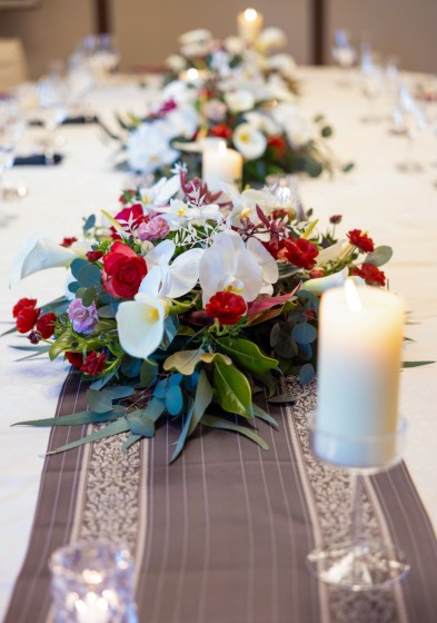 披露宴会場は深みのある色調と明るさを基調とした装花やテーブルクロスが