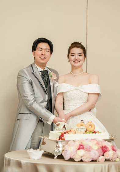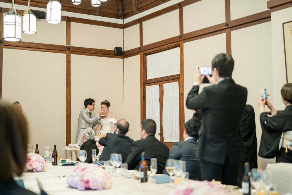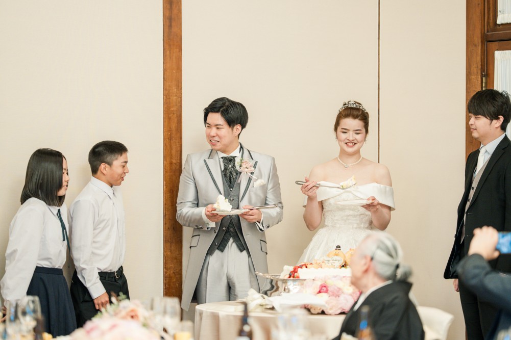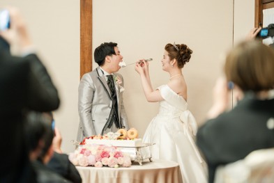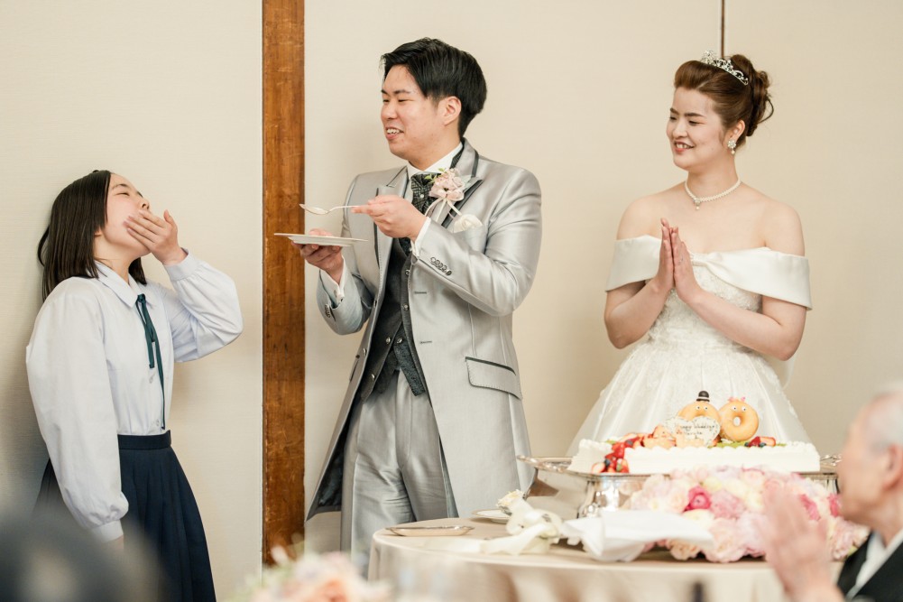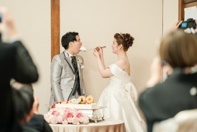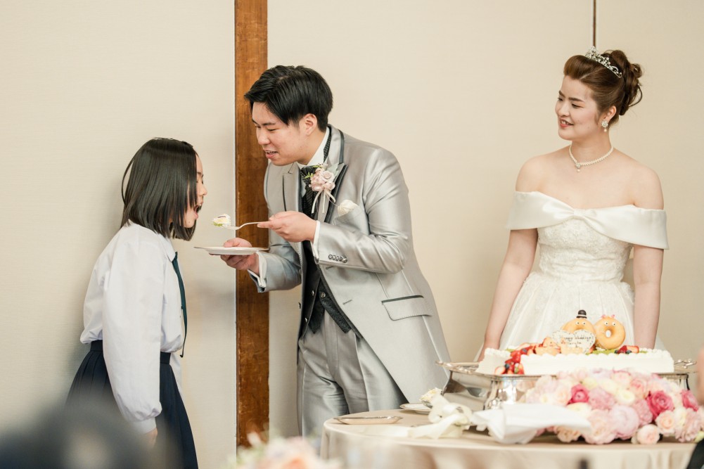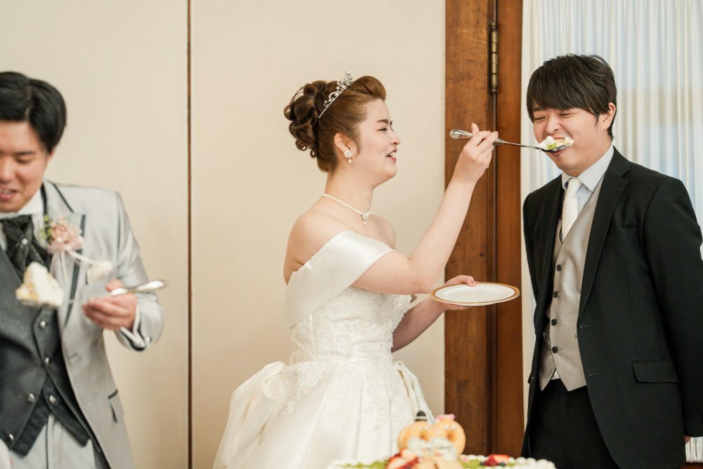 お返しに愛情がたっぷり込められたサイズのケーキを新郎様の口へと運ぶ新婦様