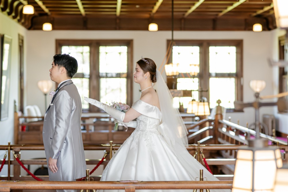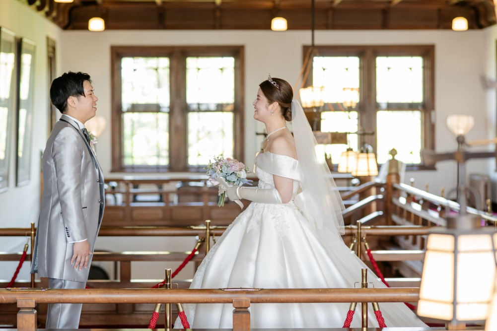 少し緊張した面持ちで待つ新郎様のもとへ新婦様がそっと歩み寄ります