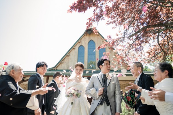 ゲストからフラワーシャワーで祝福された新郎新婦様