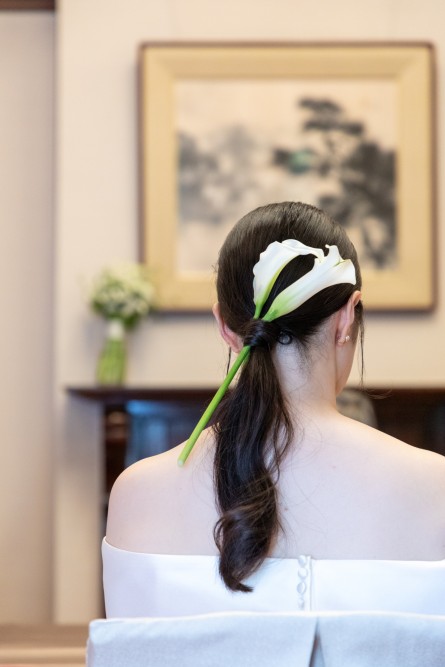 一つにまとめた髪に生花を添え華やかさをプラスした