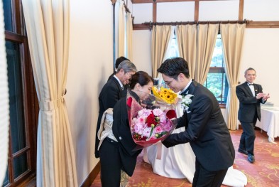 感謝の気持ちを込めてお父様へはブートニアを、お母様へは花束をプレゼント